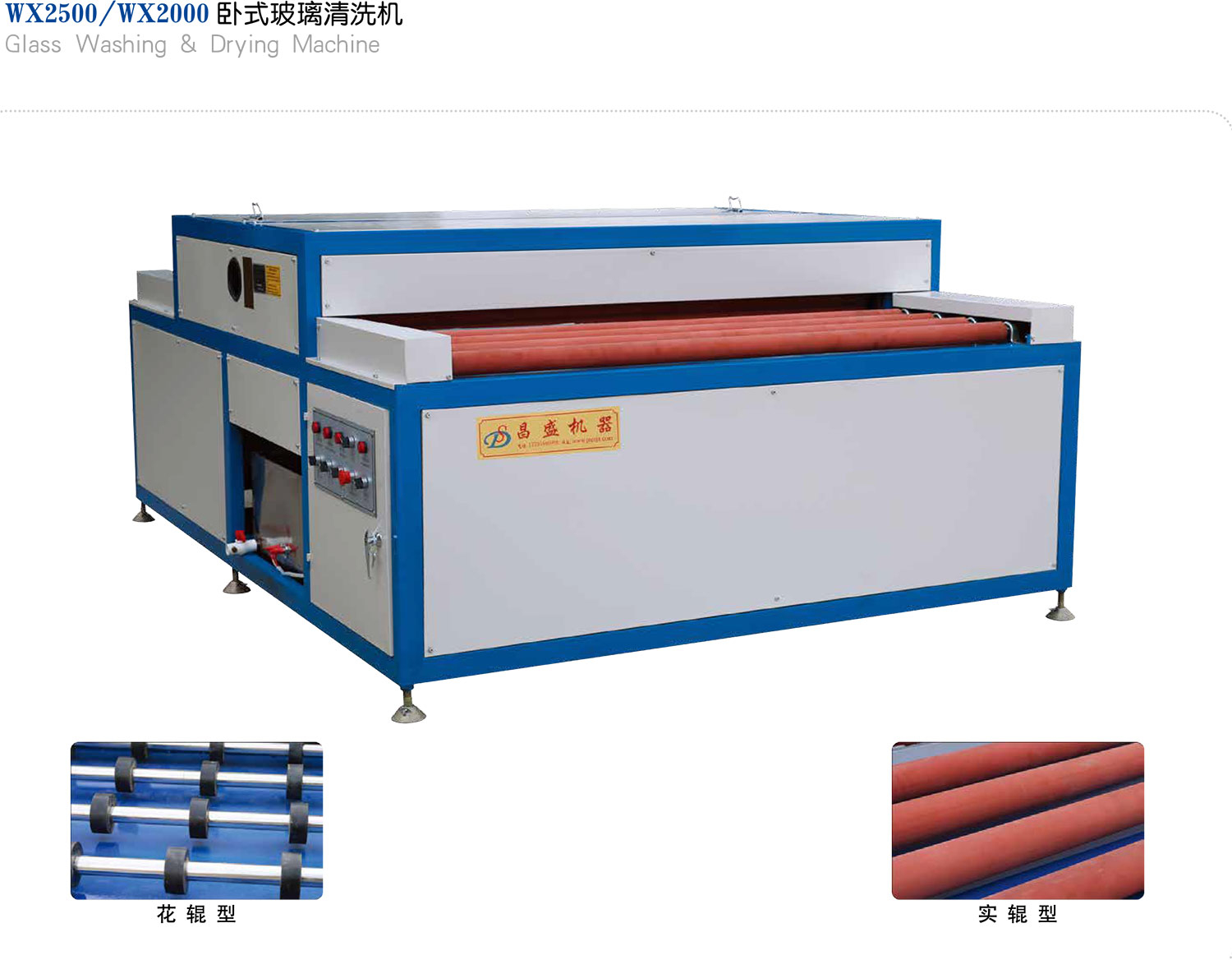 該機是用于清洗厚度3-12mm平板玻璃或小于35mm的中空玻璃.機器采用水平臥式結(jié)構(gòu).玻璃放置在傳送輯上,經(jīng)過進料段、清洗段、干燥段,到達出料段.玻璃傳送速度可根據(jù)有關(guān)工藝要求實現(xiàn)無級調(diào)速,機器操作方便.操作按鈕集中在操作臺上。